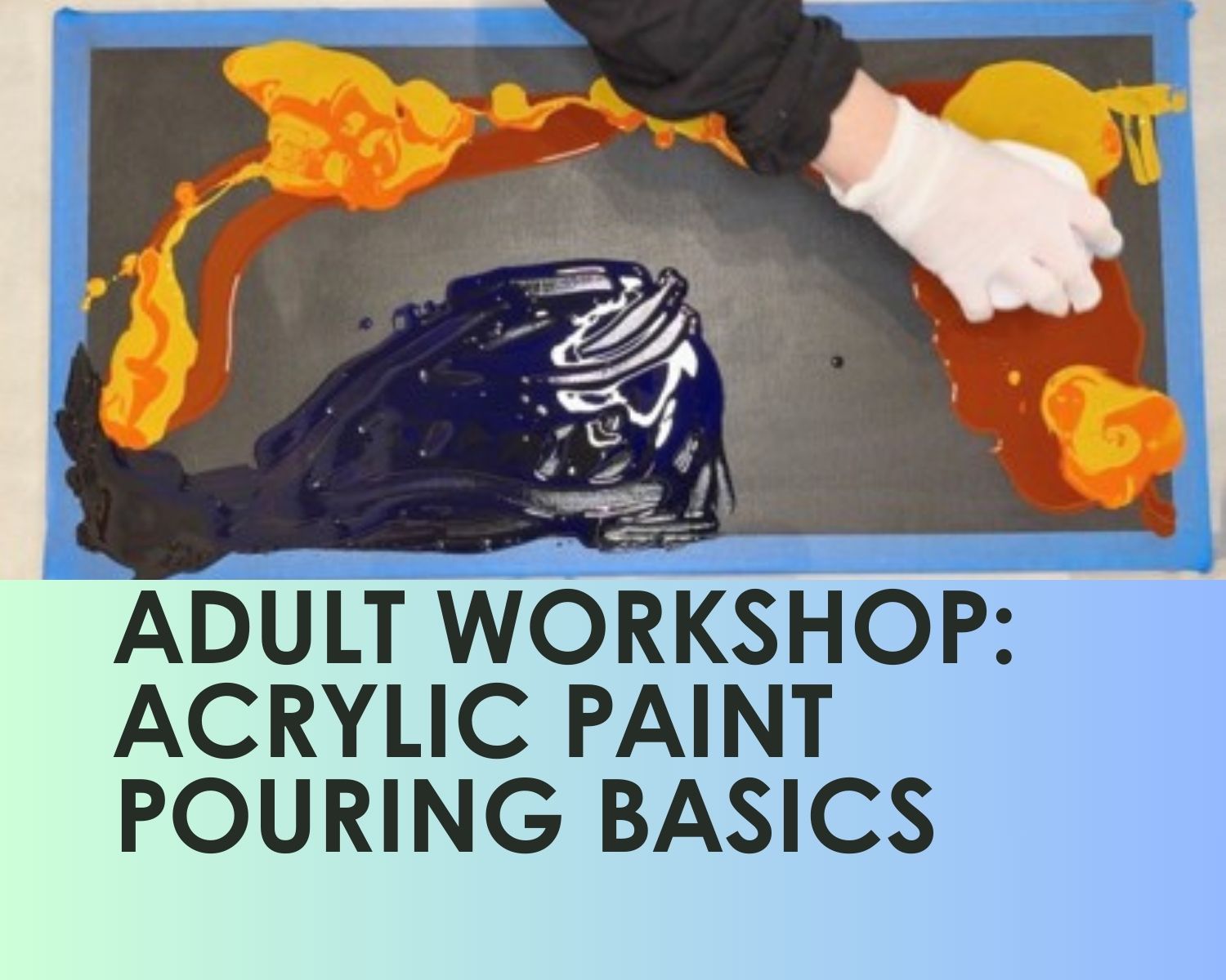 Class Description: Curious about acrylic paint pouring? Just looking for a fun, creative painting experience? Join us for this hands-on, beginner friendly workshop! You’ll learn the basics of acrylic paints, a bit of color theory, and an overview of standard fluid mediums and various pouring techniques. After a few demonstrations, it is time to create! You’ll have time to experiment and play, creating two original 8”x8” paintings to take home. No experience is required, just a sense of adventure and a willingness to get a little messy!