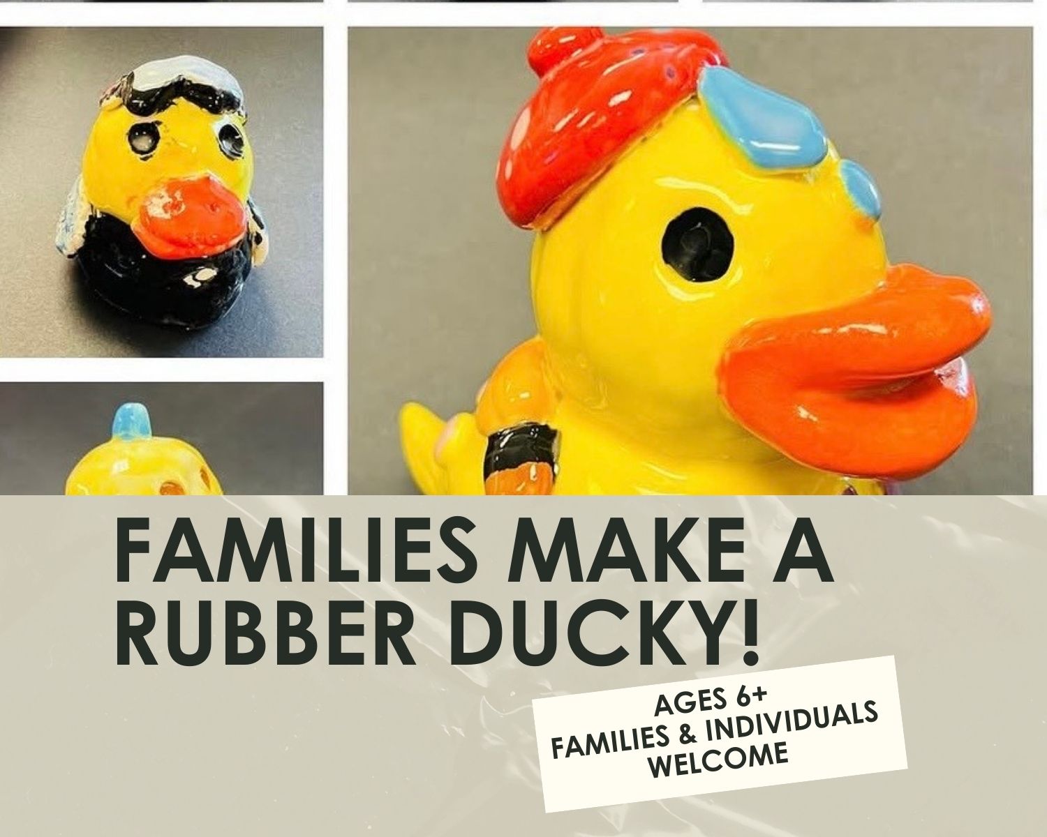 Class Description: Join our fun and interactive family-style clay class and dive into the fascinating world of pottery. In this family-friendly workshop, participants age 6 and up will learn hand building techniques to sculpt their own clay rubber ducky! What will your duck wear? Is it a super hero duck, a monster? You decide!