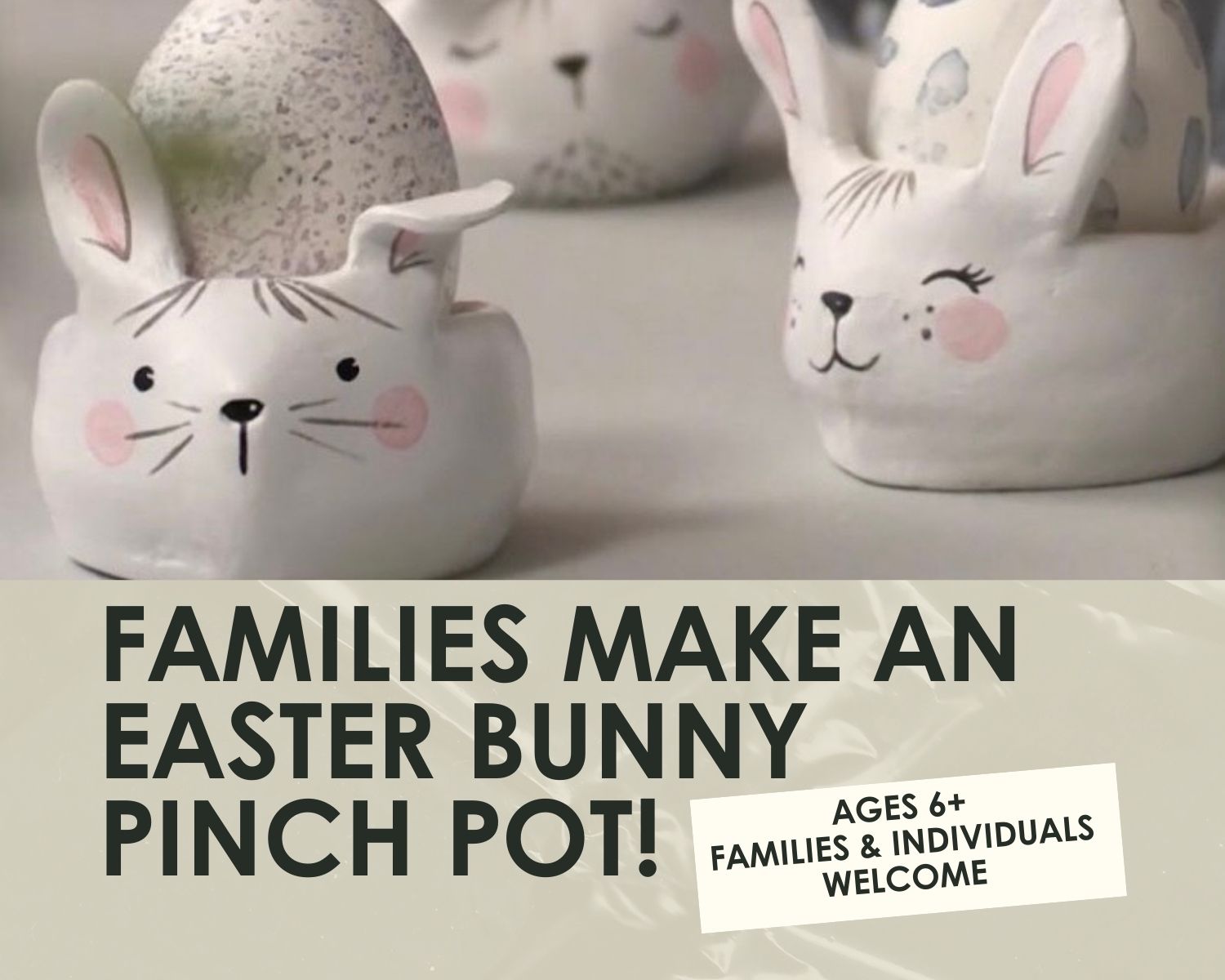 Class Description: Join our fun and interactive family-style clay class and dive into the fascinating world of pottery. In this family, friendly workshop participants will learn how to use a pinch pot method and hand building techniques to create an Easter bunny or an animal of their choice. Will it be a bunny, a dog a cat or maybe even a dragon?
